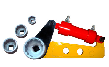 手動高壓泵由操縱手柄,高壓泵、換向閥、油箱、壓力表和帶快速接頭的輸油管等組成。帶棘輪式液壓扳手由高壓油口、液壓油缸、曲柄、反力桿、棘輪裝置、套筒等組成、前者系動力源部件,后者為扭矩執(zhí)行機構(gòu)。